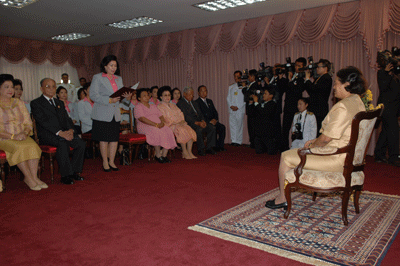 - นายมนูญ มุกข์ประดิษฐ์ กรรมการและรองเลขาธิการมูลนิธิชัยพัฒนา นำคณะบุคคลเฝ้าฯ ดังนี้ - คณะกรรมการจัดการแข่งขันวิ่งการกุศล "วิ่งเฉลิมพระเกียรติ ๕๐ พรรษา สมเด็จพระเทพรัตนราชสุดา ฯ สยามบรมราชกุมารี แพน ๑๐ กม.ศรีราชา" ซึ่งร่วมกันจัดโดยโรงพยาบาลสมเด็จพระบรมราชเทวี ณ ศรีราชา บริษัท แพนเอเซียฟุตแวร์ จำกัด (มหาชน) และบริษัท บางกอก แอธเลติก จำกัด เฝ้าฯ ทูลเกล้าฯ ถวายเงินรายได้จากการจัดการแข่งขันวิ่งการกุศลดังกล่าว เพื่อสมทบทุนสร้างอาคารอนุสรณ์ ๑๐๐ ปี โรงพยาบาลสมเด็จพระบรมราชเทวี ณ ศรีราชา อำเภอศรีราชา จังหวัดชลบุรี - คณะกรรมการร้านกีฬายิงธนูแห่งประเทศไทย เฝ้าฯ ทูลเกล้าฯ ถวายเงินรายได้จากการออกร้านงานกาชาดประจำปี ๒๕๔๙ เพื่อบำรุงสภากาชาดไทย - นายโอฬาร ไชยประวัติ ประธานกรรมการผู้จัดการ บรรษัทบริหารสินทรัพย์ไทย นำคณะ ผู้บริหาร บรรษัทบริหารสินทรัพย์ไทย (บสท.) เฝ้าฯ ทูลเกล้าฯ ถวายเงิน เพื่อสมทบทุนมูลนิธิอานันทมหิดล - นายธเนศ พรพิพัฒน์ไพศาล กรรมการผู้จัดการบริษัท อิมเม็กซ์ อินเตอร์เนชั่นแนล จำกัด นำคณะเจ้าหน้าที่บริษัท อิมเม็กซ์ อินเตอร์เนชั่นแนล จำกัด เฝ้าฯ ทูลเกล้าฯ ถวายเงินที่ได้รับบริจาค เพื่อสมทบทุน "ทุนการกุศลสมเด็จพระเทพ ฯ (เพื่อช่วยภาคใต้)" - นายปรีชา สุสันทัด นายกสมาคมศิษย์เก่ามัธยมวัดสิงห์ เขตจอมทอง กรุงเทพมหานคร นำคณะกรรมการจากสมาคมศิษย์เก่าฯ สมาคมผู้ปกครองและครู โรงเรียนมัธยมวัดสิงห์ และคณะกรรมการจัดการแข่งขันมหกรรมมวยโลก เฝ้าฯ ทูลเกล้าฯ ถวายเงินรายได้จากการจัดการแข่งขันดังกล่าว เพื่อสมทบกองทุนพัฒนาเด็กและเยาวชนในถิ่นทุรกันดาร - นางดวงเดือน วัฒนปัญญกุล นายกสมาคมส่งเสริมบุคลิกสตรี นำคณะกรรมการสมาคมส่งเสริมบุคลิกสตรี เฝ้าฯ ทูลเกล้าฯ ถวายเงิน เพื่อสมทบกองทุน ๓๐ พฤษภาคม เพื่อเป็นค่าใช้จ่ายคนไข้อนาถา สภากาชาดไทย โดยเสด็จพระราชกุศลตามพระราชอัธยาศัย - นายวิกรานต์ ตั้งศิริพัฒน์ กรรมการผู้จัดการ บริษัท ทิฟฟานี เดคคอร์ จำกัด และคณะ เฝ้าฯ น้อมเกล้าฯ ถวายโต๊ะหินสังเคราะห์โปร่งแสง และกระถางโปร่งแสง | ![]() | |