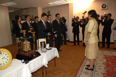 | วันอังคารที่ 29 สิงหาคม 2549 14:00:00 | เสด็จลงแทนพระองค์ ณ อาคารชัยพัฒนา พระราชทานพระราชวโรกาสให้นายภูริช มหาดำรงค์กุล กรรมการผู้จัดการ บริษัท เมืองทองไซโก จำกัด นำนายทาคาชิ วาคูยามา (Mr. Takashi Wakuyama) กรรมการบริหารและผู้บริหารสูงสุด บริษัท ไซโกวอทช์ คอร์ปอเรชั่น ประเทศญี่ปุ่น และนายบุรินทร์ วงศ์สงวน กรรมการบริหาร บริษัท เมืองทองไซโก จำกัด เฝ้าฯ ทูลเกล้าฯ ถวายนาฬิกาไซโกและเงินโดยเสด็จพระราชกุศลตามพระราชอัธยาศัย | ![]() |