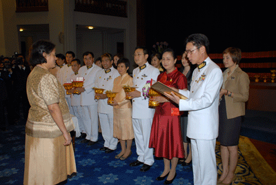 ศาสตร์ ประจำปี ๒๕๔๓ ซึ่งสำเร็จการศึกษาระดับปริญญาเอก สาขาชีวเคมี ณ มหาวิทยาลัยมิชิแกน เมืองแอนน์อาร์เบอร์ สหรัฐอเมริกา และเดินทางกลับประเทศไทยเรียบร้อยแล้ว เข้าเฝ้า ฯ เพื่อกราบบังคมทูลรายงานผลการศึกษา และทูลเกล้า ฯ ถวายผลวิทยานิพนธ์ |  |