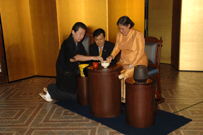 '.3.' | วันอาทิตย์ที่ 22 กรกฎาคม 2550 18:30:00 | เสด็จออก ณ วังสระปทุม พระราชทานพระราชวโรกาสให้นายโซชิสสุ เซน (Mr. Soshitsu Sen) ประธานใหญ่สมาคมพิธีชาอุระเซนเคะ ประเทศญี่ปุ่น และคณะ เฝ้า ฯ สาธิตพิธีชงชา และทูลเกล้า ฯ ถวายเงิน โดยเสด็จพระราชกุศลตามพระราชอัธยาศัย |  |