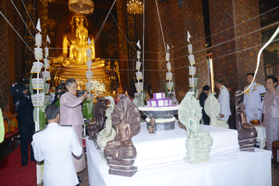 | วันพฤหัสบดีที่ 08 พฤษภาคม 2557 15:00:00 | เสด็จฯ ไปทรงเป็นประธานพิธีพุทธาภิเษกพระพุทธรูปนาคปรกจำลองประดับอักษรพระนามาภิไธย "ส.ธ." ที่ผ้าทิพย์ ซึ่งจำลองจากพระพุทธรูปประจำมหาวิทยาลัยพะเยา เพื่อเฉลิมพระเกียรติ เนื่องในโอกาสที่จะทรงเจริญพระชนมายุ ๖๐ พรรษา วันที่ ๒ เมษายน ๒๕๕๘ และหลวงพ่อทวด ณ พระอุโบสถวัดบวรนิเวศวิหาร เขตพระนคร | ![]() | |