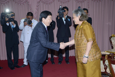 ๖. นางสาวรำภา คำหอมรื่น ผู้ทำการแทนประธานมูลนิธิบิ๊กซี พร้อมคณะกรรมการมูลนิธิฯ เข้าเฝ้าฯ ทูลเกล้าฯ ถวายเงินเพื่อสนับสนุนโครงการพัฒนาคุณภาพชีวิตเด็กและเยาวชนในพื้นที่อมก๋อย จังหวัดเชียงใหม่ ประจำปี ๒๕๕๖