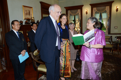 | วันเสาร์ที่ 31 พฤษภาคม 2557 12:00:00 | เสด็จลง ณ วังสระปทุม พระราชทานพระราชวโรกาสให้นายแพทย์แบร์ท ซัคมันน์ (Dr. Bert Sakmann) กรรมการรางวัลนานานชาติ มูลนิธิรางวัลสมเด็จเจ้าฟ้ามหิดล ในพระบรมราชูปถัมภ์ และคณะ เข้าเฝ้าฯ ทูลเกล้าฯ ถวายหนังสือ "อนุทินสยาม" ๑๙๐๙-๑๙๑๔ ของนายแพทย์ฟรีดริก | ![]() |