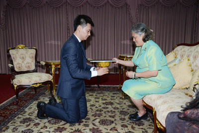| วันพุธที่ 11 มิถุนายน 2557 15:30:00 | พระบาทสมเด็จพระเจ้าอยู่หัว ทรงพระกรุณาโปรดเกล้าฯ ให้เสด็จลงแทนพระองค์ ณ อาคารชัยพัฒนา สวนจิตรลดา พระราชทานพระราชวโรกาสให้ศาสตราจารย์พิเศษ ทันตแพทย์หญิง ท่านผู้หญิงเพ็ชรา เตชะกัมพุช ประธานกรรมการแผนกทันตแพทยศาสตร์ และคณะกรรมการแผนกทันตแพทยศาสตร์ มูลนิธิอานันทมหิดล นำทันตแพทย์วัชรพงศ์ อรุณแสง ผู้ได้รับพระราชทานทุนรัฐบาลราชอาณาจักรสวีเดน สาขาทันตแพทยศาสตร์ ประจำปี ๒๕๕๔ ให้ไปศึกษาในระดับปริญญาโทคลินิก สาขาทันตวิทยา มหาวิทยาลัยมัลโม ราชอาณาจักรสวีเดน และได้สำเร็จการศึกษาดังกล่าวแล้ว เข้าเฝ้าฯ กราบบังคมทูลรายงานผลการศึกษา | ![]() |