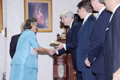| วันจันทร์ที่ 03 พฤศจิกายน 2557 09:00:00 | เสด็จลง ณ อาคารชัยพัฒนา สวนจิตรลดา พระราชทานพระราชวโรกาสให้พลอากาศเอก กำธน สินธวานนท์ ประธานกรรมการมูลนิธิพระดาบส และคณะ นำหม่อมหลวงชโยทิต กฤดากร กรรมการผู้จัดการใหญ่ เจ.พี มอร์แกน ประเทศไทย และคณะผู้บริหารฯ เข้าเฝ้าฯ ทูลเกล้าฯ ถวายเงินเพื่อสบทบทุนโรงเรียนพระดาบส | ![]() | |